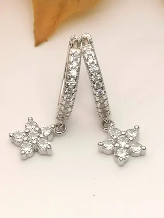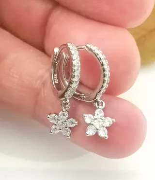 Finísimo pendiente de aro con flor colgante con Circonitas auténticas y todo en plata de ley 925. Un capricho en tus orejas por la alta gama de joyería y los excelentes acabados. Leer bien las medidas para evitar confuciones en la compra. Medidas Aro 1.40 cm de diámetro y 0.20 cm de grosor. Flor colgante 0.70 cm de diámetro. Tamaño fino para llevarlo con elegancia.