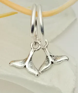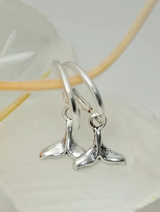 Magníficos aros con cola de ballena 🐋 colgando en plata de ley 925. Se quedan puestos muy monos y chulos, son los aros de toda la vida y en genuina plata. Mide el aro 12 mm de diámetro. La cola mide 6 mm de alto y 9 mm de ancho.