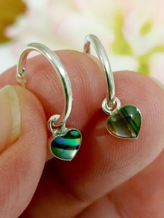 Preciosos aros de plata de ley con natural avalón corazón. ✨ - Diseño delicado y elegante. - Material: Plata de ley 925. - Incluye dos aros. Mide 11 mm diámetro Corazón avalon mide 5mm x 4 mm.