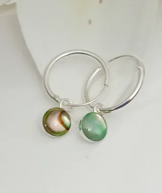 Preciosos aros pequeños de plata con delicadas bolitas colgantes de avalones naturales. Mide 11 mm de diámetro los aros. Y la bolita de avalon tiene 5 mm de diámetro. - Son dos aros. - Diseño elegante y minimalista. - Material: Plata.