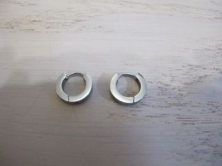 Aretes de aro lisos, hechos de plata. Son dos aretes, de 12 mm de diámetro y 30 mm de largo. Se aprecian en buen estado.