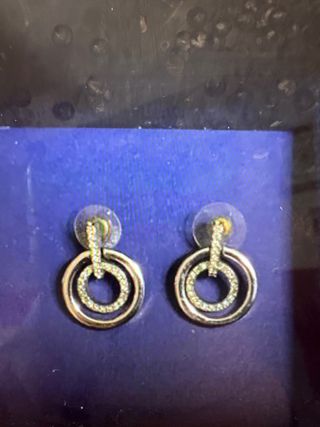 Conjunto de pendientes plateados con dos estilos diferentes. En perfecto estado! Apenas un par de usos - Pendientes colgantes con tres piezas y pedrería. - Pendientes de aro con detalles de pedrería.