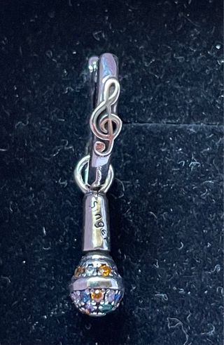 Pendientes plata aro decorado con notas musical y micrófono con cristales de color y palabra Singer grabada. Nuevo sin estrenar.