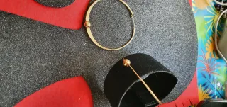 Pendientes de aro con un diseño llamativo. - Base circular cubierta con tela roja. - Adornos metálicos dorados en forma de hojas. - Pequeña cuenta redonda en el centro de cada pendiente. - Cierre tipo clip con un detalle en forma de abanico dorado. Sombrero con flores