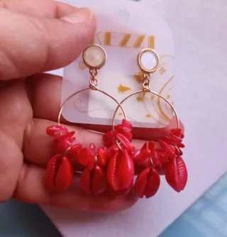 Pendientes largos con diseño de aros y colgantes de conchas rojas. - Cierre de gancho. - Detalle de cuentas rojas. - Acabado dorado en los aros y cierres.