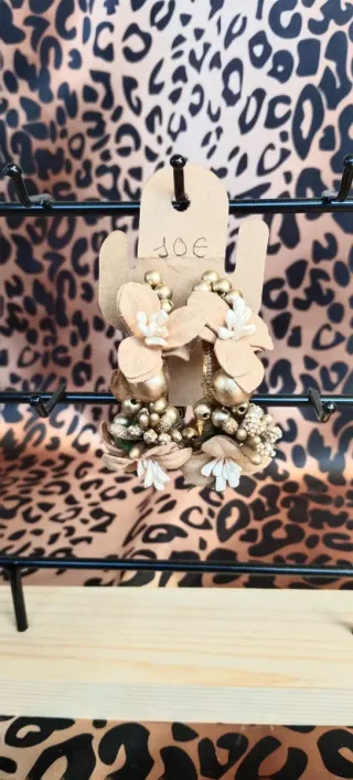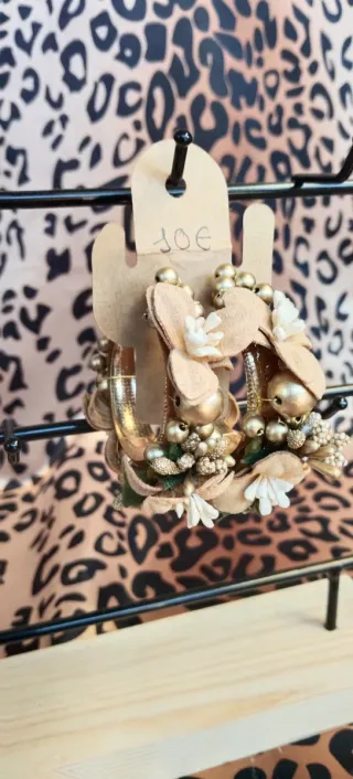Pendientes de aro con un diseño llamativo y adornos. 6 cm - Acabado en color dorado. - Detalles en tono beige. - Cierre seguro.