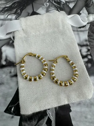 Elegantes pendientes de aro con un diseño de cuentas. - Diseño de cuentas doradas y blancas. - Cierre de presión.
