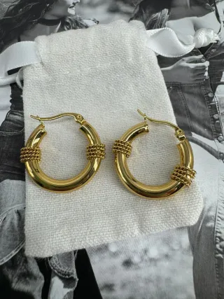 Elegantes pendientes de aro con un diseño rizado y un acabado de chapado en oro de 18 quilates. - Diseño trenzado. - Cierre seguro. No cambian de color Resistente al agua Miden 3 cm de diámetro Nuevos Con caja de regalo