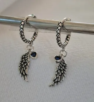 Envíos gratis a partir de 40€. 🛫 Envíos en 24h. Todos los pedidos van en caja o bolsita de joyeria. 💍 Pendientes de plata de ley con un diseño encantador. - Cierre de aro. - Colgante de ala detallada. - Corazón con gema azul.