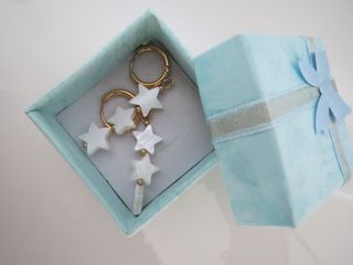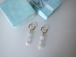 Pendientes nuevos de aro de acero dorado y nácar con motivos de estrellas. Muy favorecedores. Largura 5 cm aproximadamente. Lo envío en cajita de regalo.