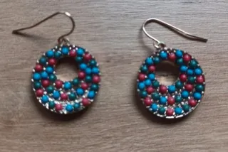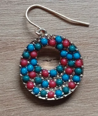Pendientes con un diseño circular y adornados con pequeñas cuentas de colores. - Diseño de aro. - Cuentas en tonos azul, rojo y verde. Pendientes de bonitos colores en forma redonda que cierran con gancho y combinan muy bien con todo