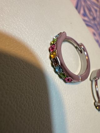 Aros de la marca Bimba y Lola con un diseño alegre y colorido. - Cuentan con pequeñas piedras engarzadas en tonos verdes y rosas. - Detalle de pequeñas piezas doradas entre las piedras.