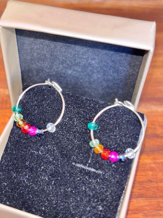 Pendientes de plata aro con un diseño vibrante y alegre. - Abalorios de cristal en varios colores. - Cierre de gancho plateado.