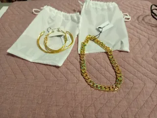 Vendo conjunto original de Bimba y Lola, nuevo con etiqueta y bolsita original. - Pulsera multicadena dorada con detalle circular calado y pequeños abalorios de colores. - Pendientes tipo aro pequeño con diseño orgánico a juego y brillantes PRECIO NEGOCIABLE