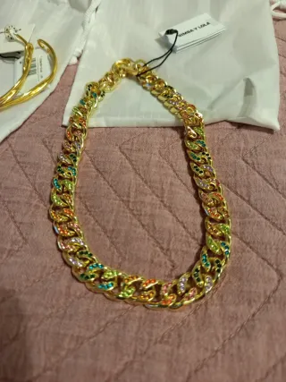 Conjunto de collar y pendientes de la marca Bimba y Lola. - Collar de eslabones con detalles de colores. - Pendientes tipo aro dorados.