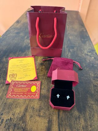 Se venden pendientes cartier unisex, con su caja bolsa y papeles originales, forma de cruz con circonitas. Precio negociable