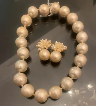 Elegante conjunto de collar y pendientes con perlas. - Collar de perlas cultivadas grandes. - Pendientes a juego con detalle floral.