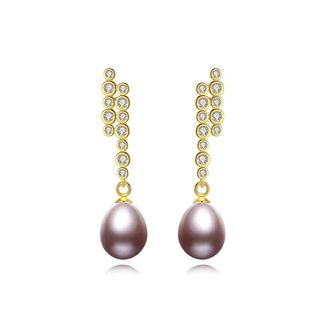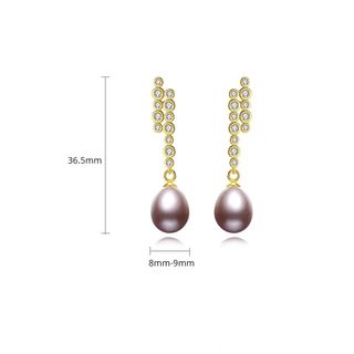Elegante par de pendientes de perlas cultivadas. Los aretes tienen un diseño sofisticado. Medidas 36.5mm Perla 8mm. - Diseño de perlas colgantes con detalles dorados. - Piedras brillantes engastadas en el diseño dorado. - Perlas de color morado oscuro.