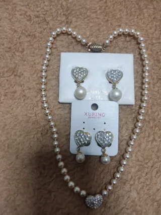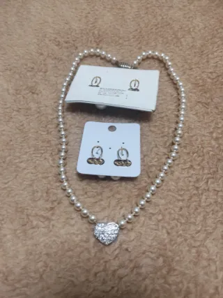 Elegante conjunto de collar y pendientes. - Collar de perlas blancas con un colgante de corazón. - El corazón está adornado con pedrería brillante. - Los pendientes a juego complementan el collar.solo un par de pendientes o perla gorda o perla más pequeña.