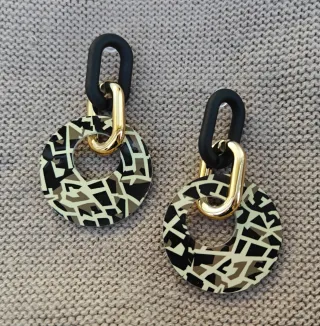 Pendientes colgantes con un diseño abstracto, combinan dos eslabones alargados en color negro mate y dorado brillante, con un aro circular grande colgante con motivos geométricos. Están hechos de resina, lo que los hace ligeros y cómodos de llevar. Tienen un estilo llamativo y moderno, que puede añadir un toque atrevido a cualquier atuendo. Se entregan presentados en bolsita de joyería, perfecto para regalo.