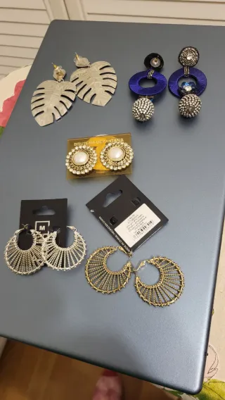 Conjunto de pendientes de bisutería con diseños variados. - Pendientes grandes con forma de hoja. - Pendientes colgantes con aros azules y detalles brillantes. - Pendientes redondos con perla central y borde adornado. - Pendientes tipo aro con diseño calado y detalles. - Pendientes dorados con forma de abanico y cuentas. También se venden por separado por 3€ .
