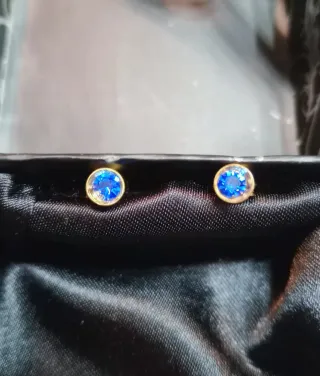 Pendientes pequeños dorados con piedra azul brillante en el centro. Más joyería y bisutería en mi perfil