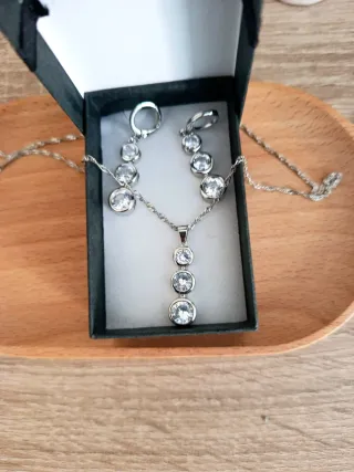 Elegante conjunto de joyería que incluye collar y pendientes. - Diseño con tres brillantes en cascada en el collar. - Pendientes a juego con brillantes. - Cadena fina y delicada.