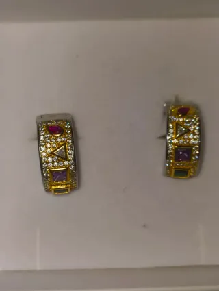 Elegantes pendientes de oro con un diseño moderno y llamativo. - Detalles en circonitas brillantes. - Acentos de piedras. - Acabado en oro. Se venden por no usar en ninguna ocasión,y la caja no sabemos si es la original