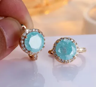 Elegantes pendientes chapados en oro con una piedra central de color verde intenso, rodeada de pequeños cristales brillantes. - Diseño circular. - Cierre seguro.