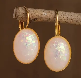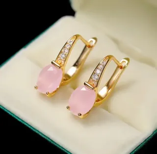 Elegantes pendientes chapados en oro con detalles de circonitas y una piedra central en tono rosa. - Diseño ovalado de la gema. - Cierre de presión seguro. - Acabado brillante.