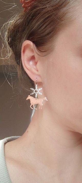 Pregunta en oro. Caballo simbolo de año nuevo Caballo de fuego. Son de acero inoxidable! Conjunto de pendientes con un diseño delicado y original. - Colgante en forma de copo de nieve. - Colgante adicional con silueta de caballo. - Acabado metálico brillante.