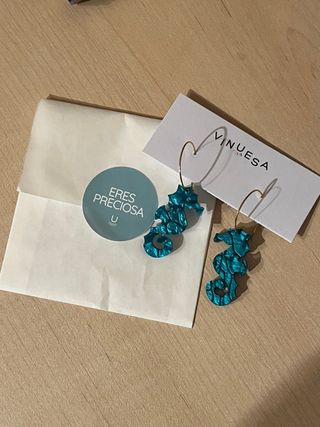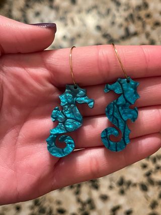 Pendientes de metacrilato con diseño de caballito de mar. No pesan nada. El material es azul turquesa con unas vetas brillantes. Son originales, solo tienen una puesta. Se envían con el embalaje original.