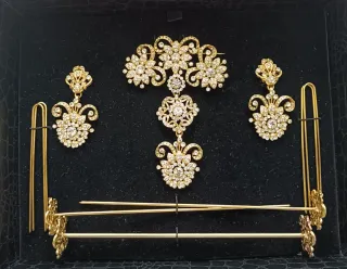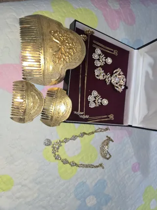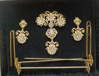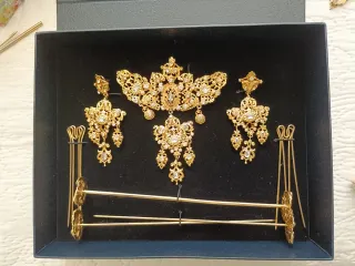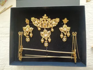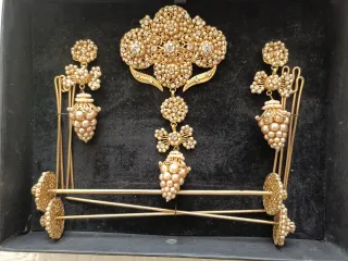 Conjunto de aderezo de fallera de estilo tradicional, con un diseño intrincado y detalles brillantes. - Pieza central con colgante. - Pendientes a juego. - Incluye horquillas. - Elaborado en metal dorado.