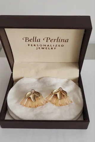 Elegantes pendientes vintage de la marca Bella Perlina. Un diseño único que combina hojas y un estilo abanico. - Detalles en forma de hojas doradas. - Elemento central con una pequeña piedra brillante. - Base con pliegues en tono naranja translúcido. Super bonitos. Tienen años, y siguen preciosos. Con circonitas. Cristales. De calidad. En cajita joyero, no es la caja original de estos pendientes.