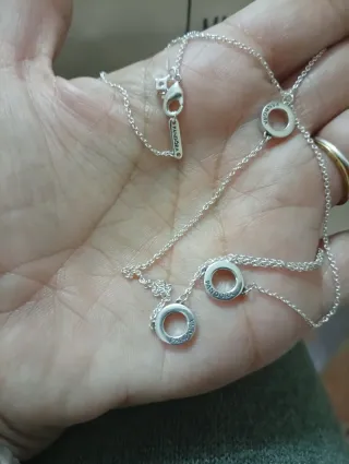 Elegante conjunto de la marca Pandora.pendiente y gargantilla - Diseño de aros entrelazados. - Adornados con circonitas brillantes. - Cadena fina de plata.