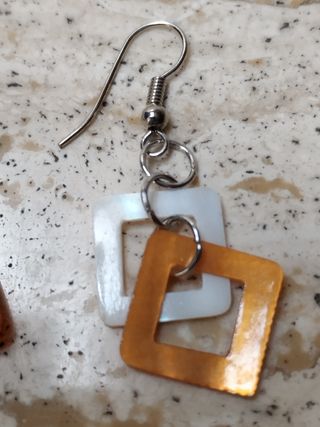 Preciosos pendientes de verano. Son dos pares de pendientes con forma cuadrada. Están hechos con un material que parece nácar en tonos blancos y anaranjados. - Diseño moderno y elegante. - Perfectos para cualquier ocasión.