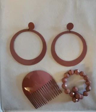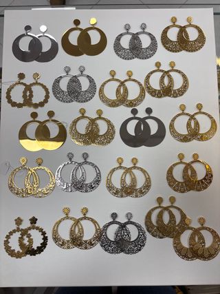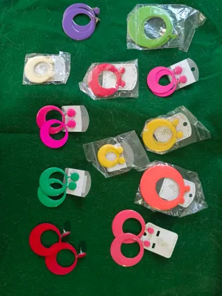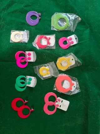 Conjunto de accesorios de moda, ideal para complementar atuendos. - Incluye varios pares de pendientes de diferentes estilos. - Varios broches para sujetar o decorar. - Diseños variados y llamativos.