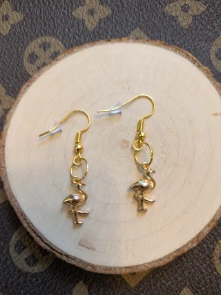Bonitos pendientes con un diseño de flamenco. - Cierre de anzuelo. - Detalle de flamenco. - Acabado dorado. Restos de una tienda de ropa y complementos que tiene mi hermana