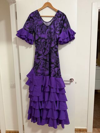 Vestido de flamenca con un estampado llamativo de flores moradas sobre fondo negro. Incluye pendientes y flor a juego. - Mangas con volantes. - Falda con múltiples volantes.