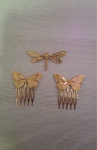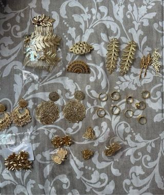Preciosa colección de joyería flamenca dorada, ideal para complementar tu traje de sevillana. - Incluye 2 pares de pendientes, 5 horquillas para el pelo, 9 anillos, 2 broches, 4 peinetas, pinzas decorativas. - Piezas con detalles delicados y elegantes. - Perfecto estado