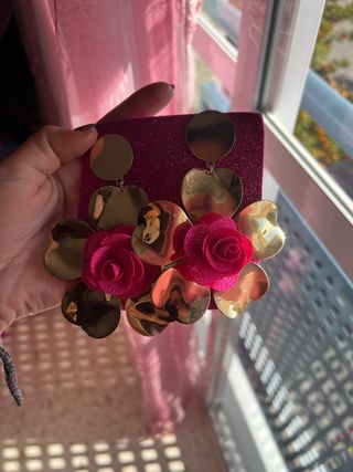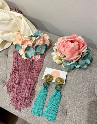 Conjunto de complementos de flamenca de la marca Conchi Alcaraz. Piezas únicas para lucir en ferias y romerías. - Pendientes grandes con aros dorados. - Detalle de piedras rojas y rosas. - ramilletes florales -broches para mantón Los ramilletes valorados en 20€ aprox se venden a 15€ la unidad y los pendientes valorados en 15-20€ se venden a 12€ el par.
