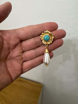 Elegantes pendientes dorados con una preciosa piedra turquesa y una perla blaca
