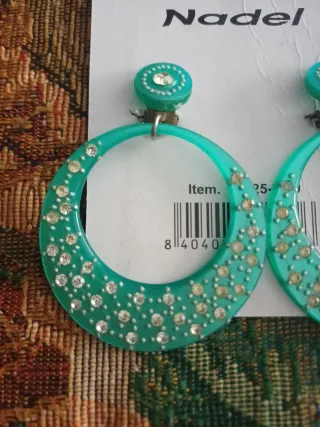Pendientes de estilo flamenco con un diseño llamativo. - Pieza superior cuadrada con borde dorado. - Colgante en forma de lágrima en tono verde A estrenar