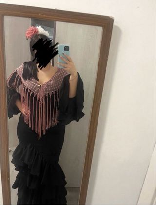Vendo este traje de flamenca negro conjunto con su mantoncillo,pendientes,flores,broche de libélula para el mantoncillo y los peinecillos de mariposa. -Me lo probé todo, el traje es precioso se estira muy bien y es muy cómodo.Lo iba a estrenar este año pero ni me lo llegue a poner porque no pude ir a la feria,está todo nuevo -El traje es comprado en una página y me hice una foto con todo puesto pero esta en otro móvil,si quieres más información escríbeme!!<3