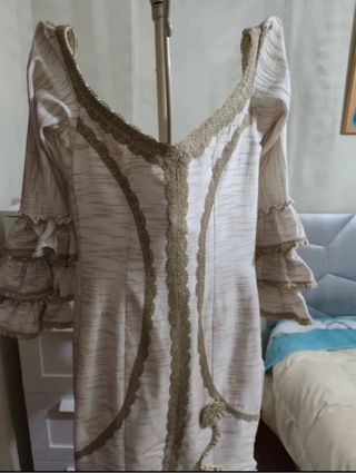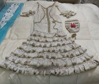 Traje de flamenca hecho a mano con un diseño elegante y volantes.tela no elastica - Adornado con detalles en dorado. - Mangas acampanadas con volantes. - Incluye una bombonera pequeña(esta un poco descosido) y pendientes color rojos
