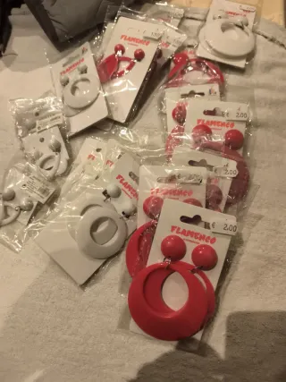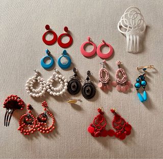 Conjunto de pendientes para flamenca o sevillana. - Diseños variados. - Incluye pendientes en color blanco y rojo.