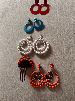 Conjunto de pendientes de estilo flamenco. - Pendientes en color rojo. - Pendientes en color naranja. - Pendientes en color azul.