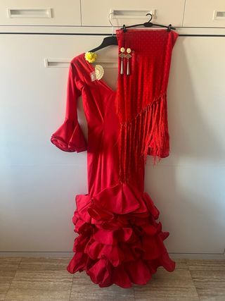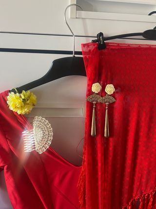 Vendo Conjunto de traje de flamenca, mantón, flor y pendientes. Esta todo usado de un día en la feria de 2024.