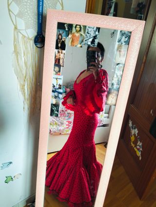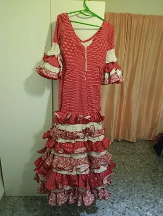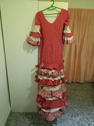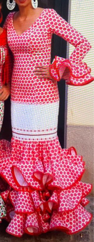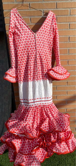 Vestido de flamenca con un diseño clásico de lunares. - Estampado de lunares blancos sobre fondo rojo. - Mangas acampanadas. - Volantes en el bajo. Pecho 95-96, cintura 86, cadera 105-106. largo de hombro a pies 144-145 Vestido hecho a medida. Tiene tela para meter y sacar. Incluyo los pendientes, el clavel y la peineta. Solo me lo he puesto una vez Cualquier duda de medidas o más fotos no dudes en decirme