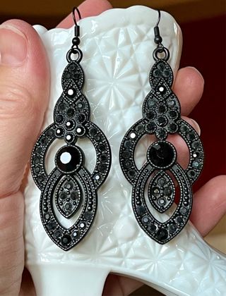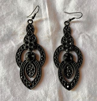 Bonitos pendientes vintage estilo flamenco; o de luto? Desconozco el material; parece azabache ya que deja huella en papel. Largo: 6cm Ancho: 2,5cm (parte más ancha). Muy poco uso, perfecto estado.